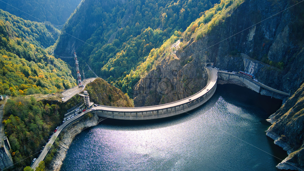 Aerial drone view of nature in Romania. Valley in Carpathian mountains with Vidraru dam and lake, slopes with lush forest