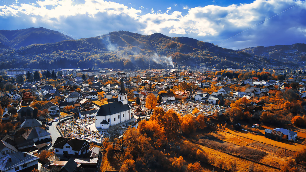 Aerial drone view of Viseu de Sus, Romania. A lot of residential buildings, ?hurch with cemetery, hills covered with yellowing trees