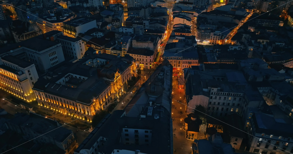 Aerial drone view of illuminated Bucharest cityscape in the evening. Moving traffic. Blue hour, Romania Royalty Free Stock Video Footage