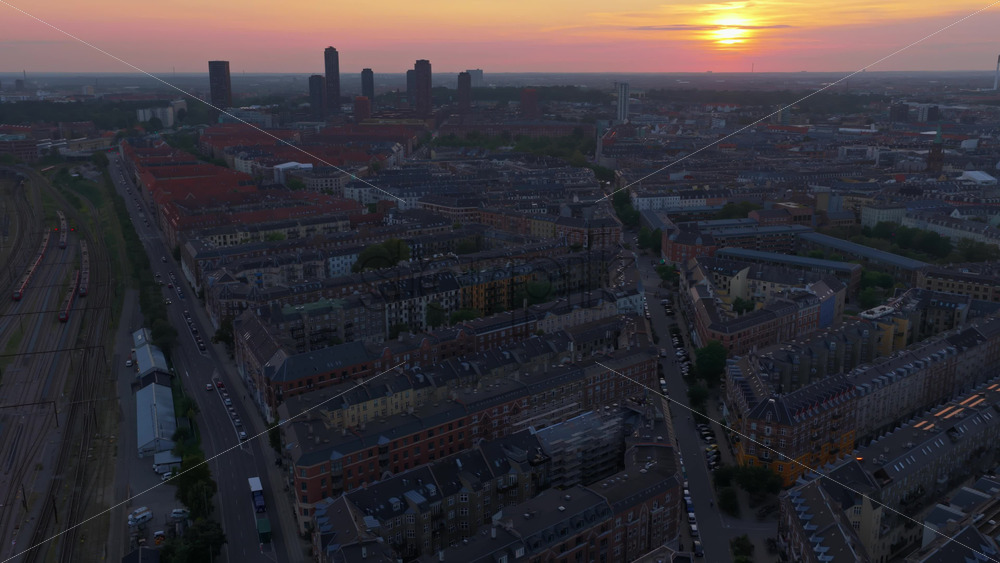 Aerial drone view of railway lines and rooftops in Vesterbro with the sun setting behind modern towers in Copenhagen, Denmark Royalty Free Stock Video Footage