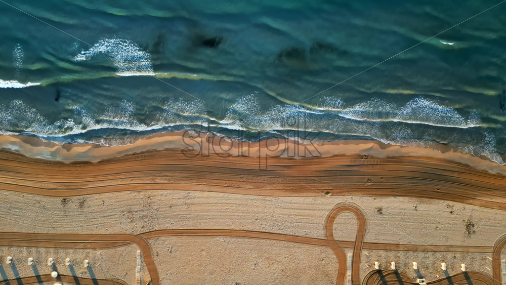 Aerial drone view of waves hitting the shore on the beach in Alicante, Spain. Vertical Royalty Free Stock Video Footage