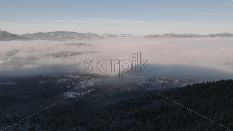 Aerial drone view of winter mountains with fog in Ceahlau National Park, Romania Royalty Free Stock Video Footage
