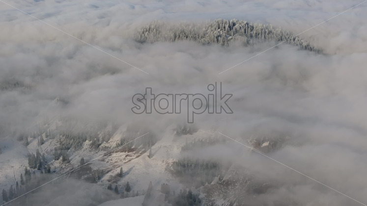 Aerial drone view of winter mountains with fog in Ceahlau National Park, Romania Royalty Free Stock Video Footage