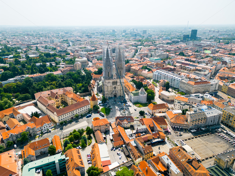 Home » Shop » photo » Aerial drone view of Zagreb, Croatia. Historical city centre with multiple old buildings made in national style, Zagreb Cathedral, greenery