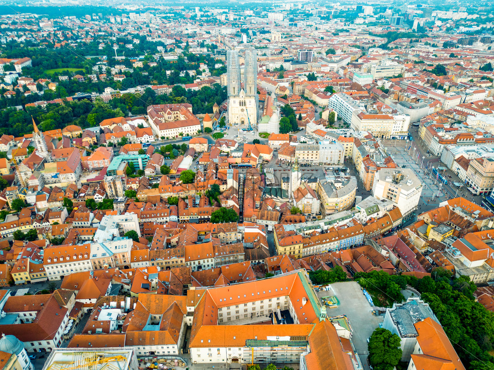 Home » Shop » photo » Aerial drone view of Zagreb, Croatia. Historical city centre with multiple old buildings made in national style, Zagreb Cathedral, greenery