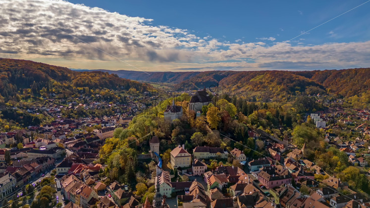 Aerial drone panoramic view of the The Black Church in old Brasov centre, Romania. Old residential buildings around it, narrow streets with moving cars, hills with greenery