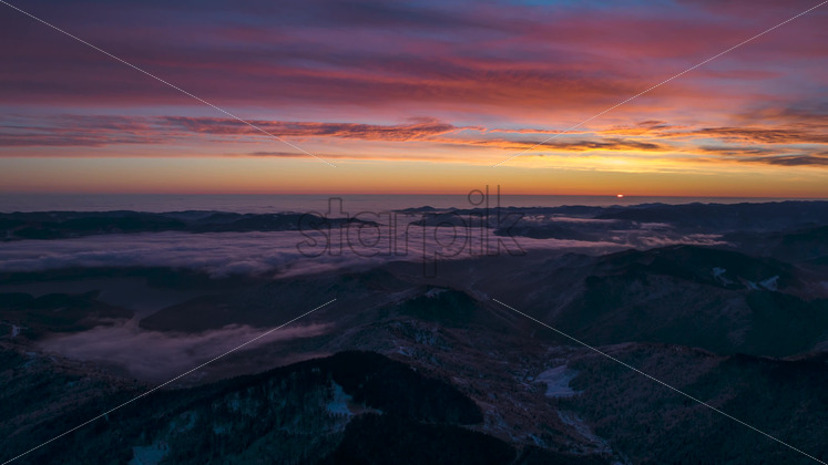 Premium Aerial cinematic timelapse drone view of sunrise in Ceahlau National Park, Purple orange sky and fast moving clouds, Romania
