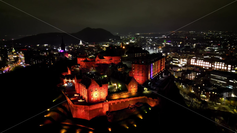 Aerial view of the Edinburgh Castle on Castle Rock at night with the illuminated city on the background Edinburgh, Scotland Royalty Free Stock Video Footage