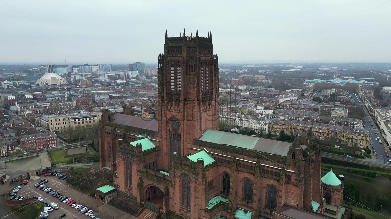 Aerial view of the Liverpool Cathedral with the city on the background Liverpool, England Royalty Free Stock Video Footage