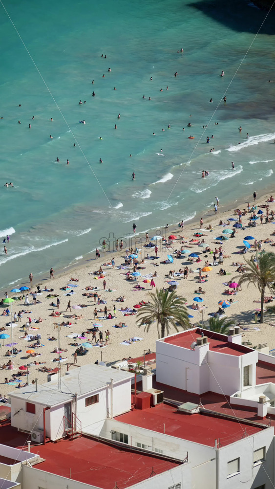 Aerial view of turquoise water, a sandy beach and seafront apartment blocks with swimmers and umbrellas visible below. Vertical Royalty Free Stock Video Footage