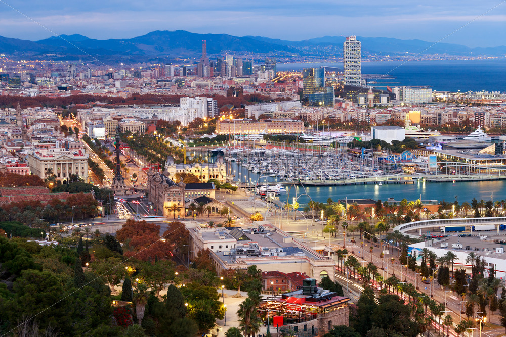 Aerial view over Barcelona city at blue hour, port and roads, Spain