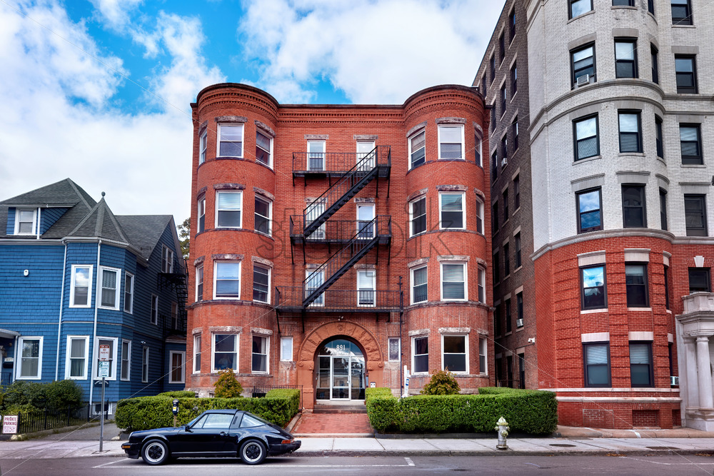 Aged residential buildings made of brick with parked vintage car in front of it in Cambridge, USA