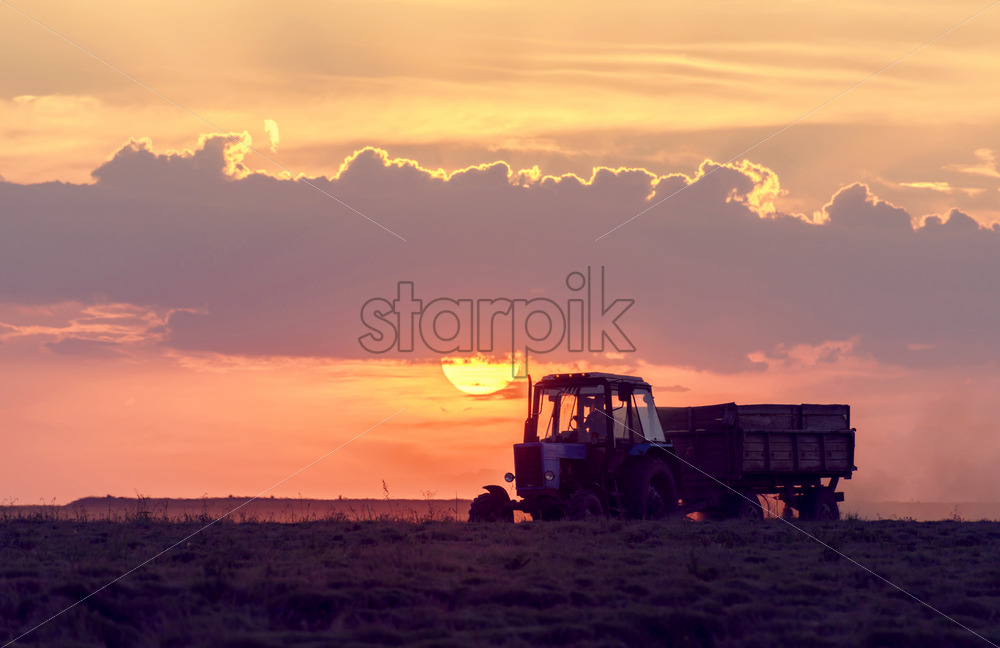 Agricultural machines work in the field, against the background of big red sun at sunset in Moldova