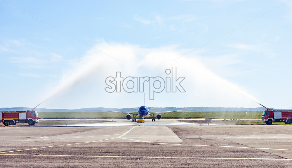 Airplane water salute procedure in Chisinau International Airport. Aviation day in Moldova Royalty Free Stock photo