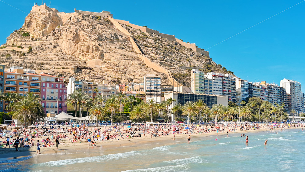 ALICANTE, SPAIN – APRIL 2023: People on a beach near mountain Benacantil and Santa Barbara Castle