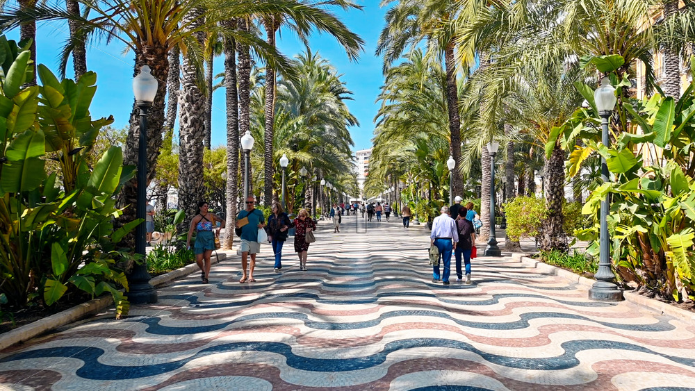 ALICANTE, SPAIN – APRIL 2023: People walking on the street Explanada de Espana with palm trees and detailed pavement