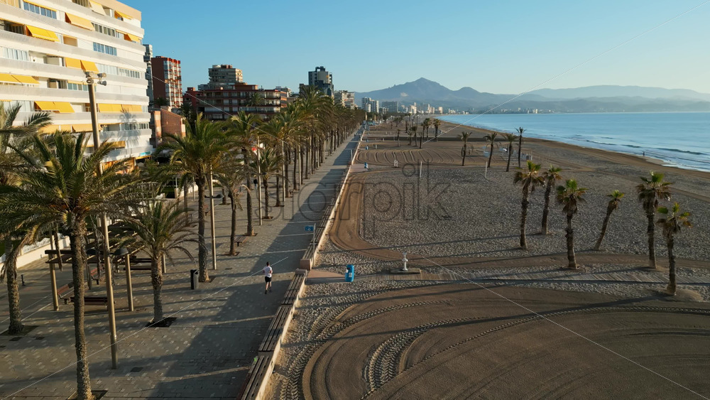 Alicante, Spain – June 20, 2025: Aerial drone view of palm trees on a promenade near the beach and buildings along coastline of the city Royalty Free Stock Video Footage