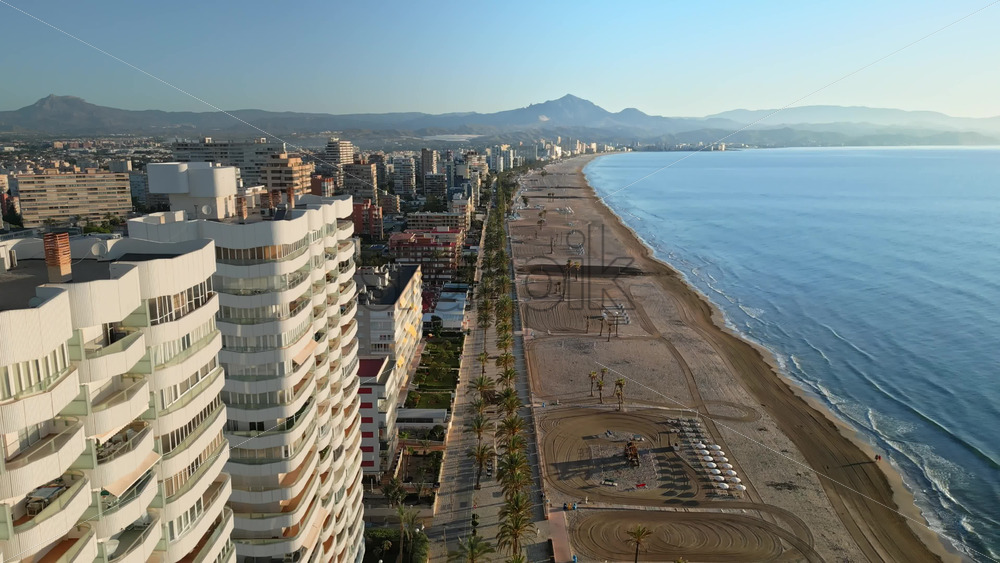 Alicante, Spain – June 20, 2025: Aerial drone view of palm trees on the beach and buildings near the coastline of the city at sunset Royalty Free Stock Video Footage