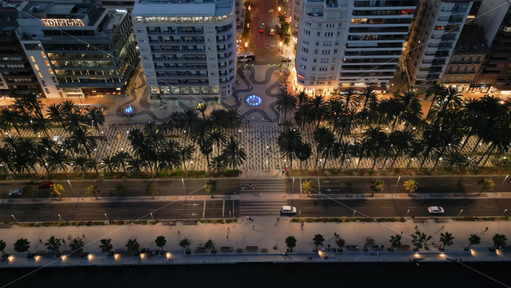 Aerial drone view of cars moving between the buildings in Alicante, Spain in the evening. Vertical Royalty Free Stock Video Footage