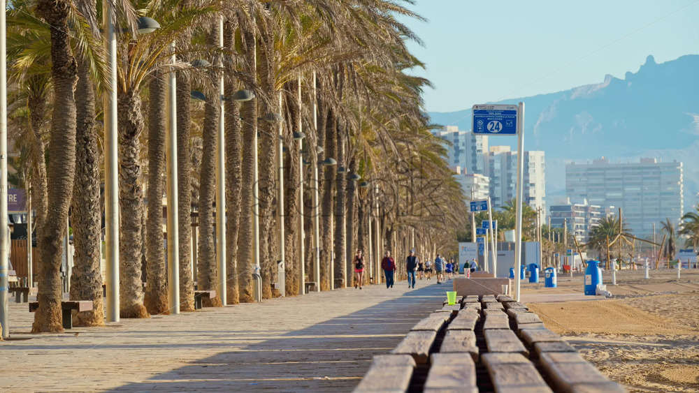 Alicante, Spain – May 19, 2025: People walking on a palm tree lined promenade near the beach at sunrise Royalty Free Stock Video Footage