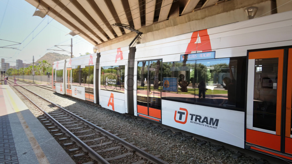 Alicante, Spain – May 19, 2025: White and orange light rail train departs a sunny surface platform beneath a bridge at the Tram d’Alacant network Royalty Free Stock Video Footage