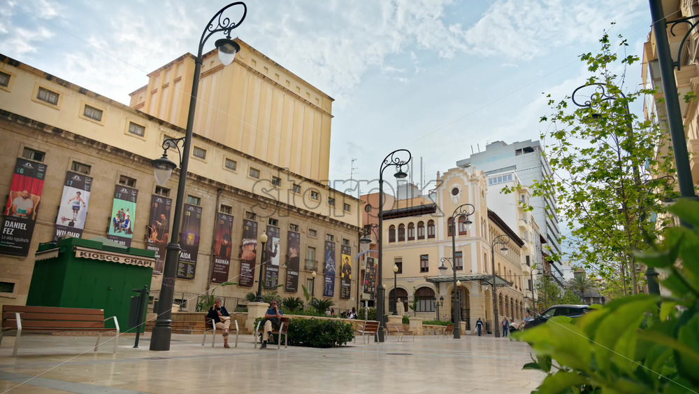 Alicante, Spain – May 20, 2025: Calm square with benches, ornate street lamps, and theatre posters near Teatro Principal Royalty Free Stock Video Footage