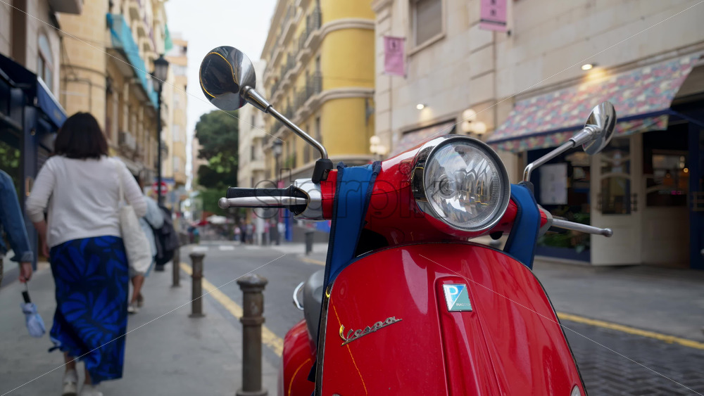 Alicante, Spain – May 20, 2025: Close up of a red Vespa scooter parked on a busy pedestrian street Royalty Free Stock Video Footage