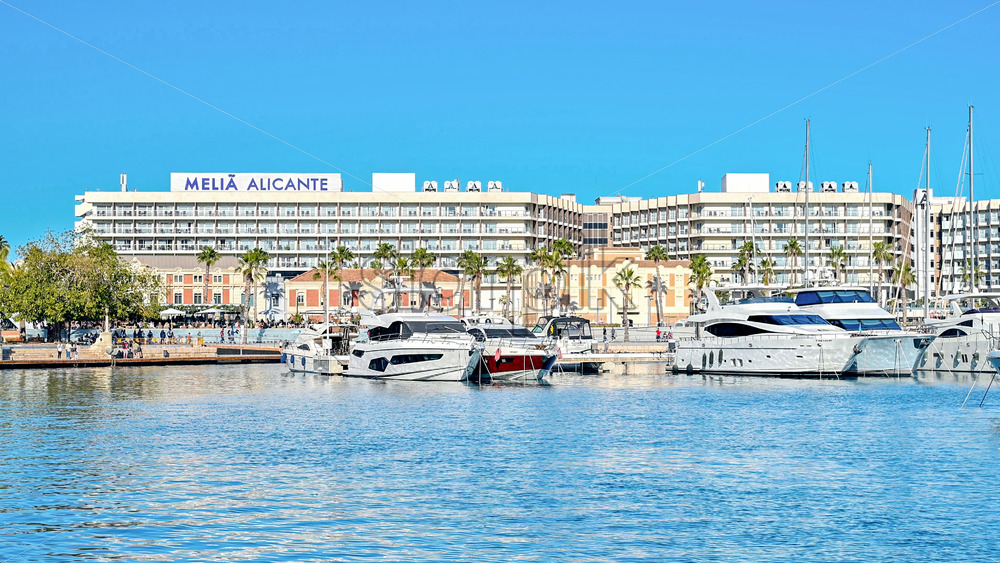 ALICANTE, SPAIN – MAY, 2023: View of boats at the port near shoreline