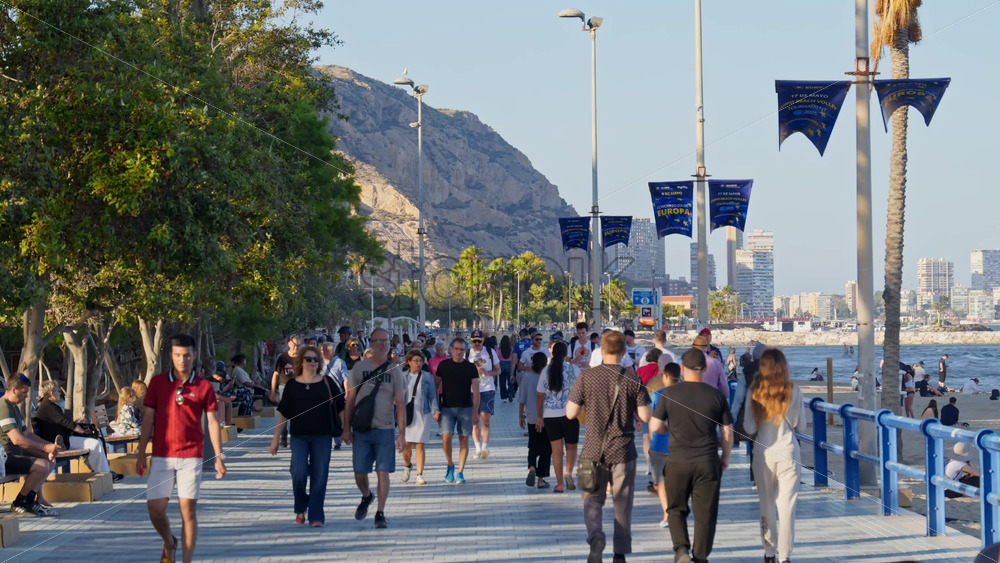 Alicante, Spain – May 22, 2025: Crowds strolling Paseo de Gomiz on Playa del Postiguet Royalty Free Stock Video Footage