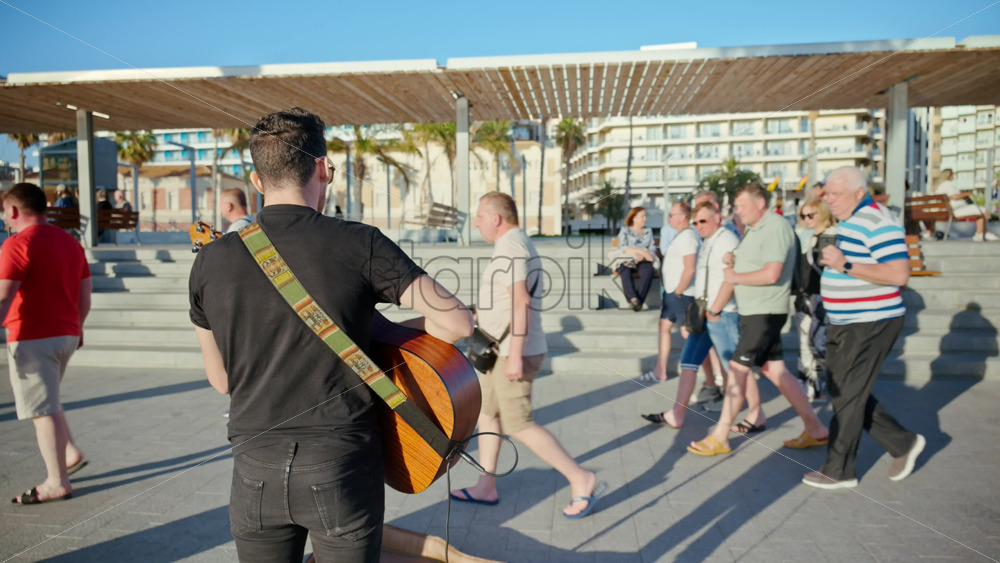 Alicante, Spain – May 22, 2025: Man playing the guitar in a crowded square in daylight Royalty Free Stock Video Footage