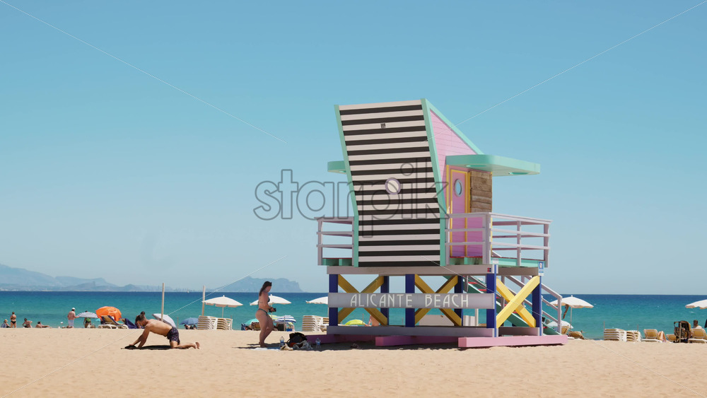 Home » Shop » 1 Video » Video – Alicante, Spain – May 22, 2025: View of a colourful lifeguard tower on the San Juan Beach in daylight