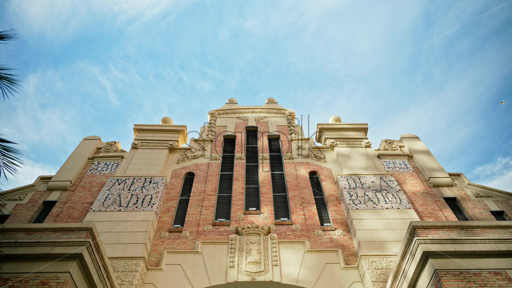 Alicante, Spain – May 23, 2025: Low angle view of a historic market facade cream stone Royalty Free Stock Video Footage