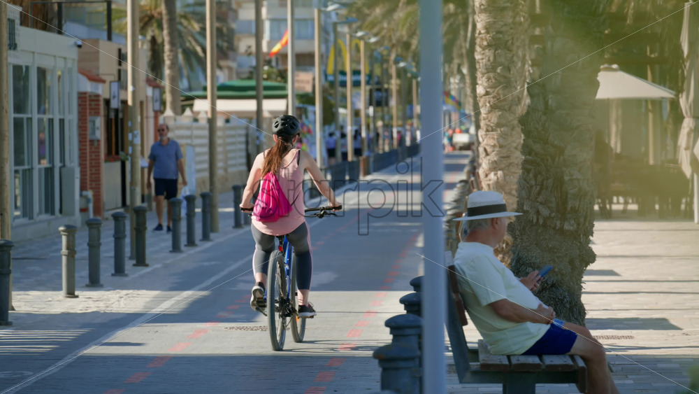 Alicante, Spain – May 24, 2025: Cyclist cruising the dedicated lane along the San Juan Beach promenade Royalty Free Stock Video Footage