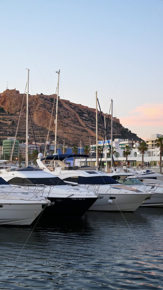 Alicante, Spain – May 26, 2025: A line of luxury boats rests with the Melia Alicante as a backdrop in soft pink skies. Vertical Royalty Free Stock Video Footage