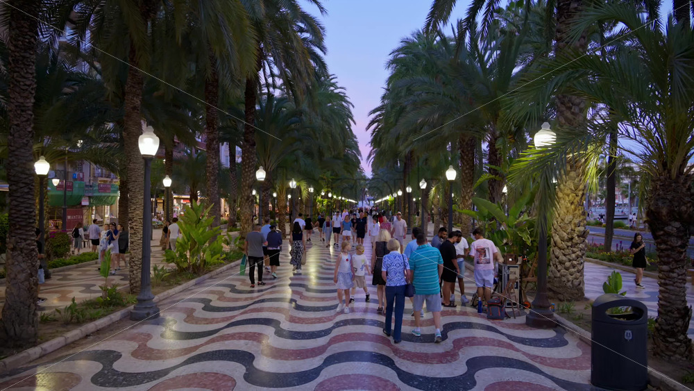 Alicante, Spain – May 26, 2025: The wave mosaic of the Explanada de Espana glowing at dusk beneath rows of palms Royalty Free Stock Video Footage
