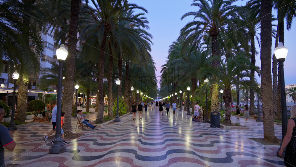 Alicante, Spain – May 26, 2025: The wave mosaic of the Explanada de Espana glowing at dusk beneath rows of palms Royalty Free Stock Video Footage