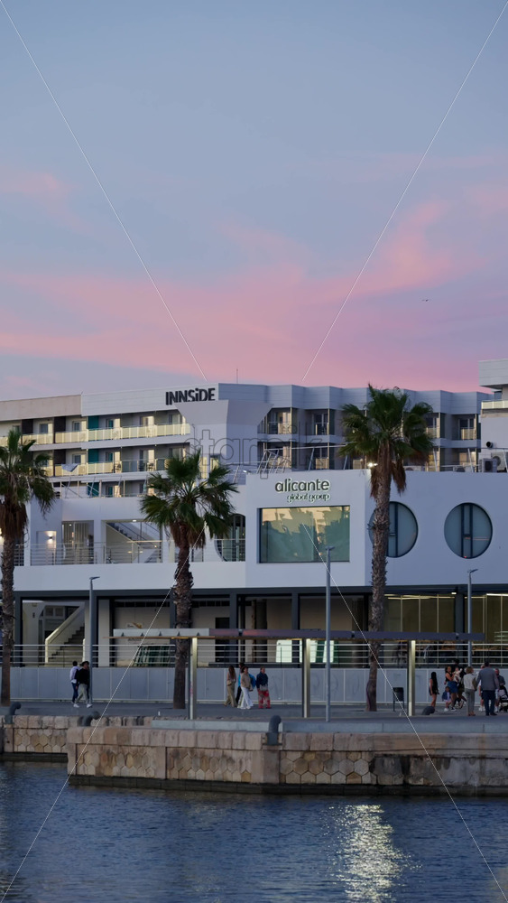 Home » Shop » 1 Video » Video – Alicante, Spain – May 30, 2025: A line of luxury boats rests with the Melia Alicante as a backdrop in soft pink skies. Vertical