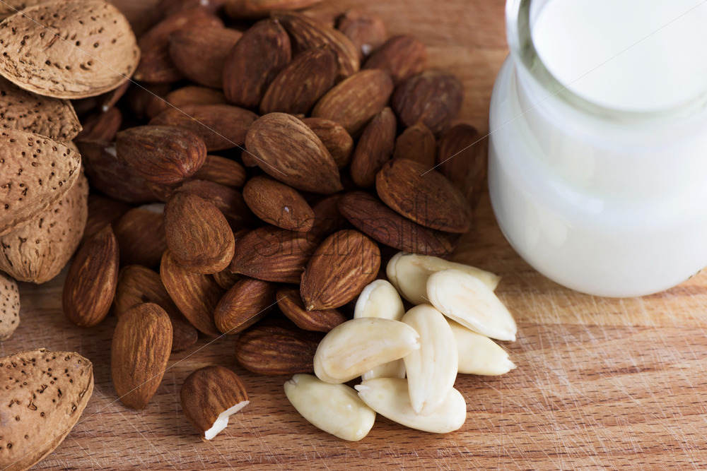 Home » Shop » photo » Almond nuts with white milk macro close up composition