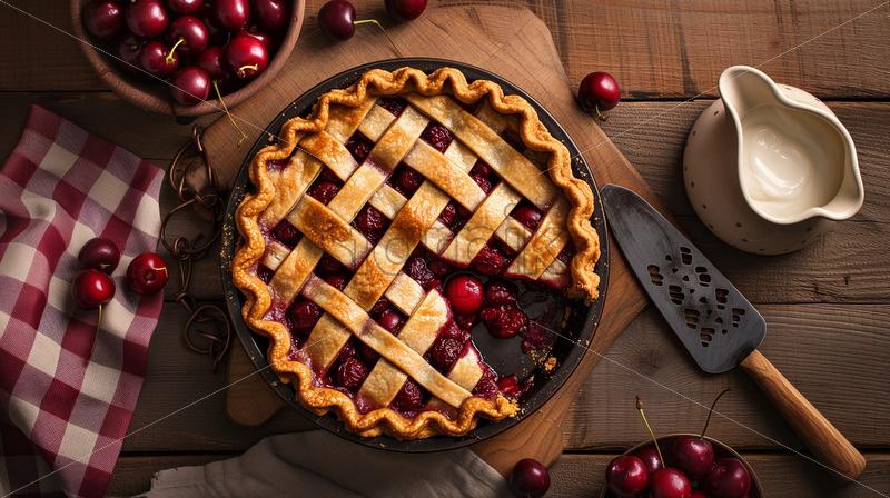 A delightful image featuring slices of a classic American cherry pie, artfully arranged on a rustic pie dish.