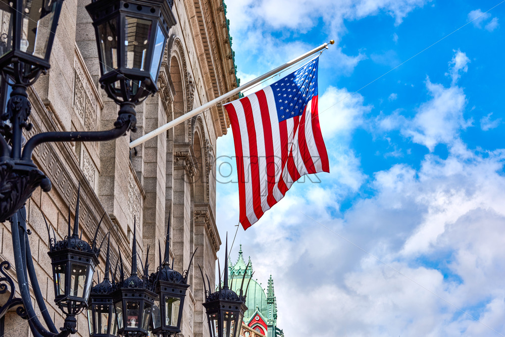 American flags at a classic court building with blue cloudy sky on background. Boston, Massachusetts Royalty Free Stock photo