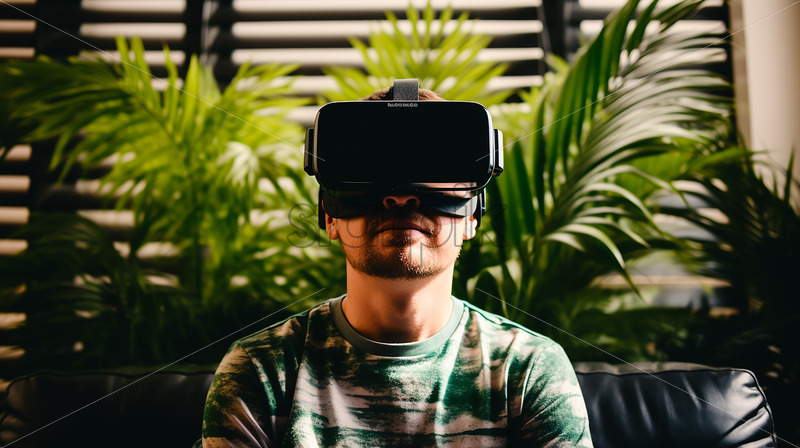 Black american man enjoying his virtual reality goggles in their entertainment room surrounded by some of the greenery plant