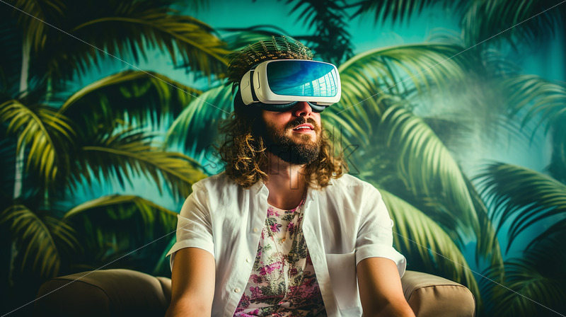 Home » Shop » Uncategorised » American man satiesfied on what his seeing by wearing virtual reality goggles in their entertainment room surrounded by the greenery painted at the background