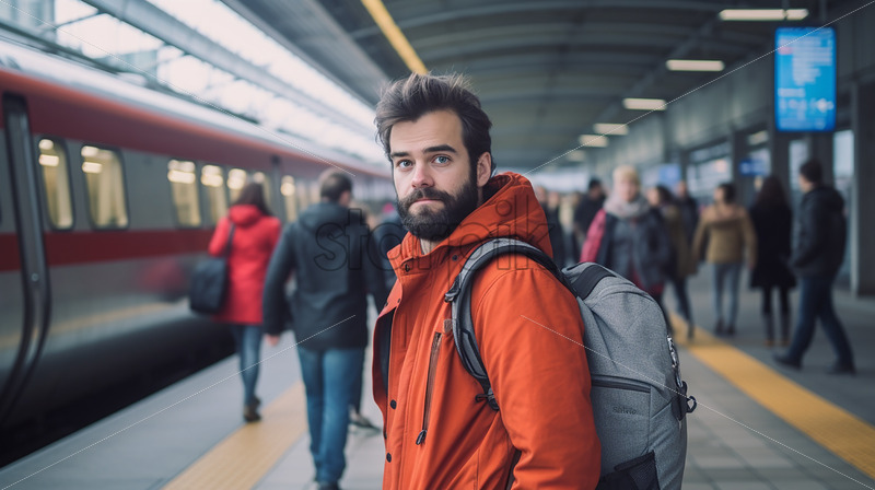 American man walking in the train station waiting for his departure