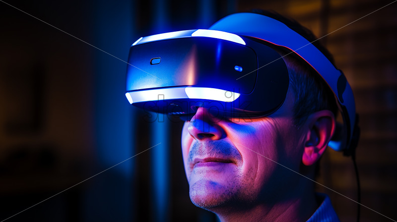American man wearing virtual reality goggles in their entertaining living room with blue lights refelcting on the goggles