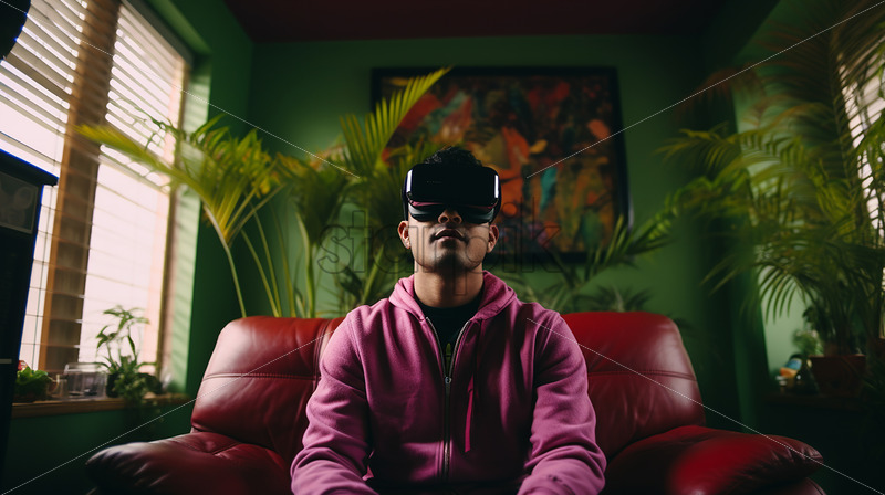 American man wearing virtual reality goggles in their entertainment room surrounded by the greenery of reality
