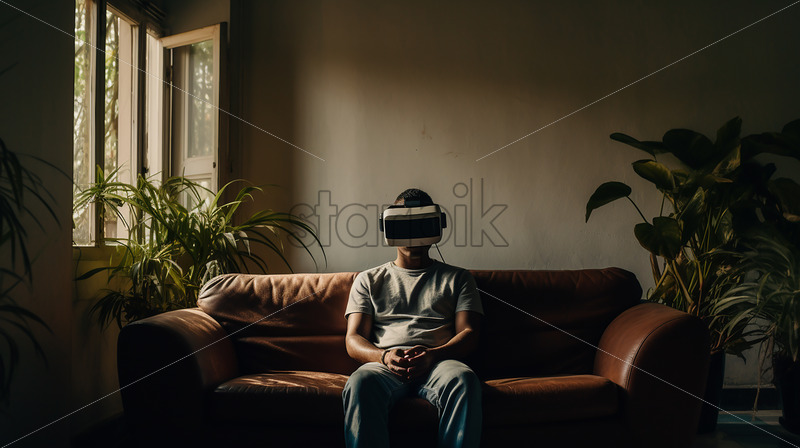 Home » Shop » Uncategorised » American man wearing virtual reality goggles in their living room quietly
