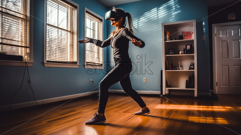 American woman wearing virtual reality goggles in their spacious living room happy on what she seeing