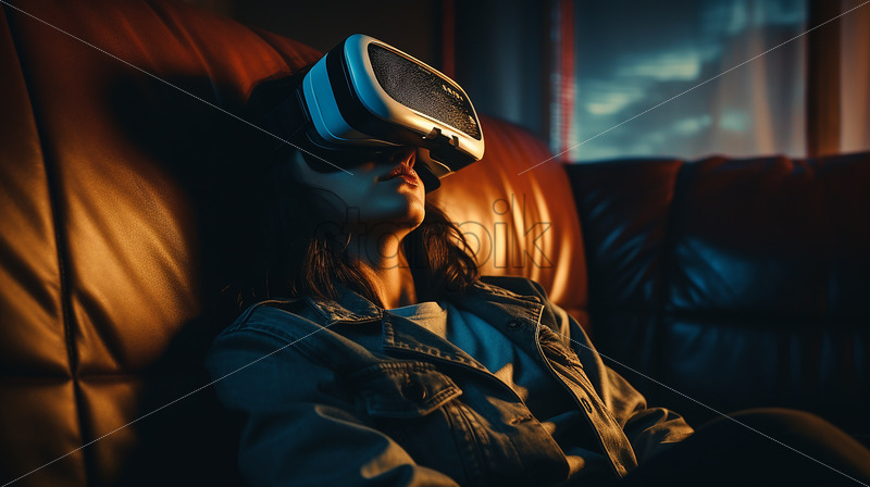 American woman wearing virtual reality goggles in their entertainment room to relax