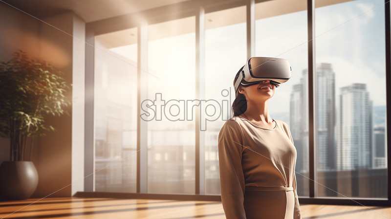 American woman wearing virtual reality goggles in their spacious living room happy on what she seeing