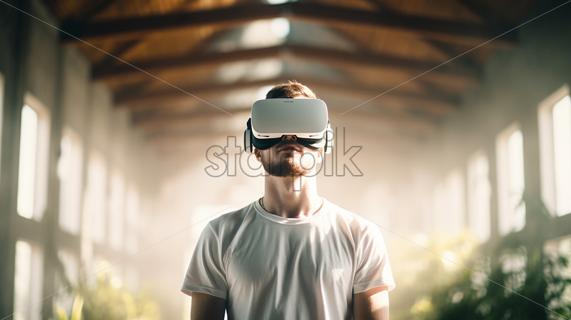 American man wearing virtual reality goggles in their spacious living room who focused on his new goggles